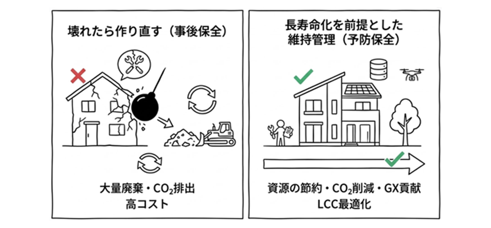 「壊れたら作り直す」時代から、「長寿命化を前提とした維持管理」の時代へ。適切なメンテナンスを続けること自体が、強力なGX施策(環境への貢献)となるのです。