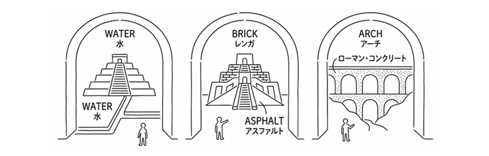 そして、古代ローマの水道橋。数十キロ先の水源から街まで「一定の勾配で水を運ぶ」という超難題に対し、堅牢な「アーチ構造」と、水中でも硬化する新素材「ローマン・コンクリート(火山灰を利用)」を開発し、深い谷をも越える長距離インフラを完成させました。