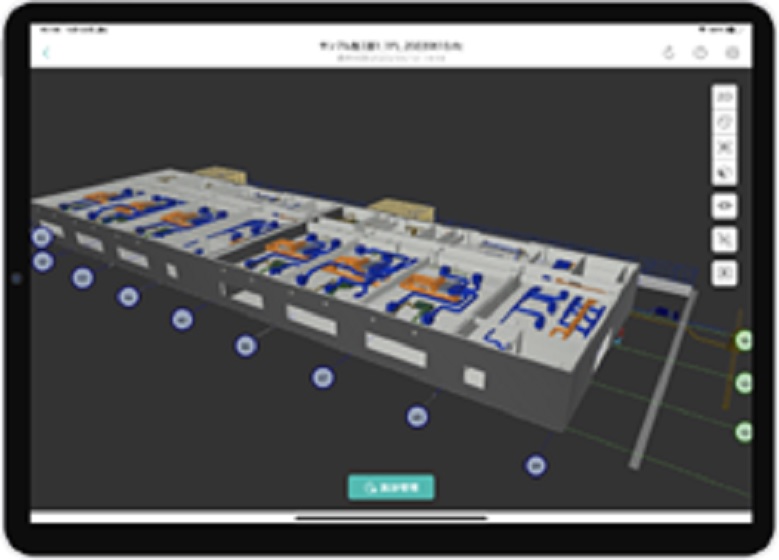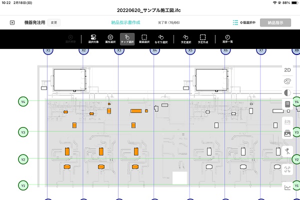 - 現場で3Dモデルで色付けされた部材を確認、発注します。また、取引先の各サプライヤーもクラウド上のモデルと機器表を確認、各種製作の開始、発注を進めていくことができます。