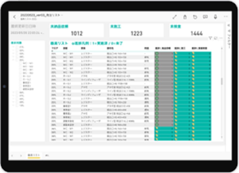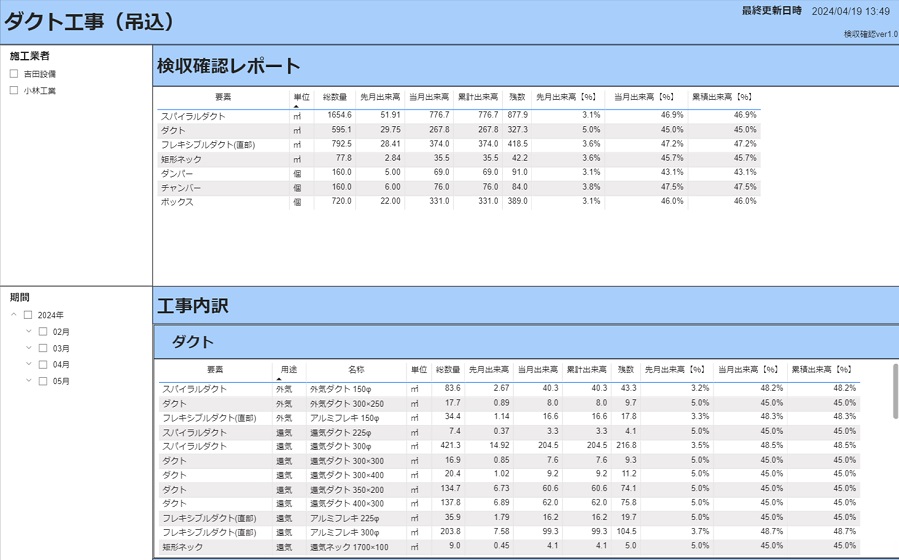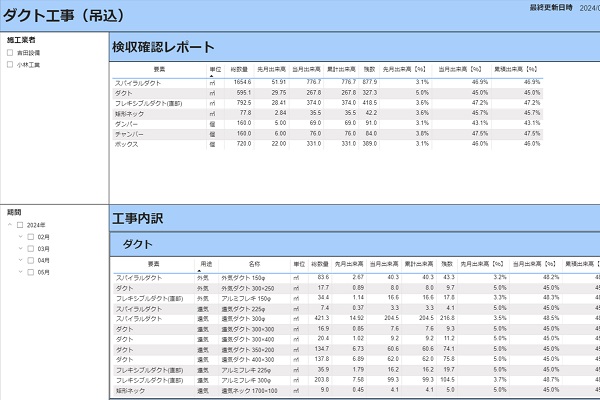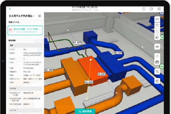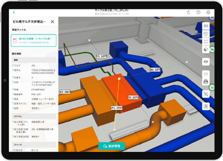 - 図面をアップロードするだけで、例えば「スリーブリスト」や 「制気口リスト」などの部材リストが作成・更新できます。 また3D上で進捗を登録すれば、リスト上でも進捗情報が更新されます。
