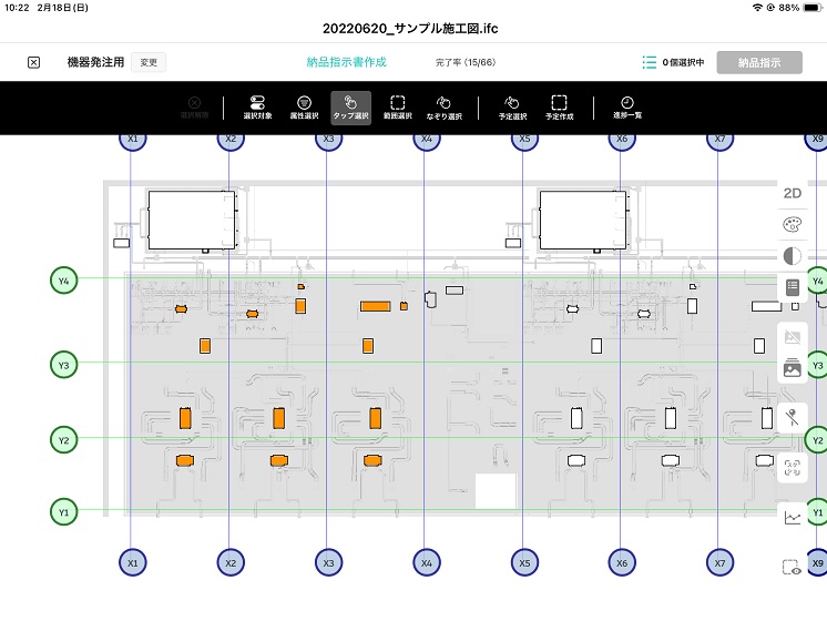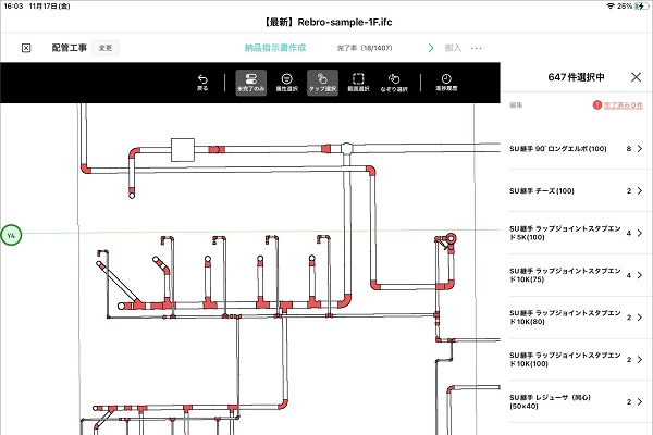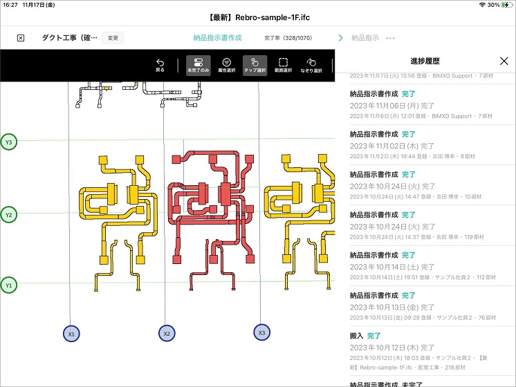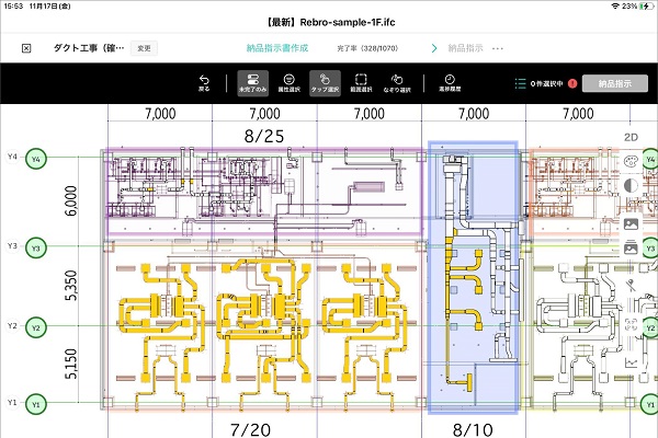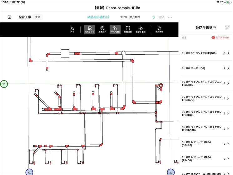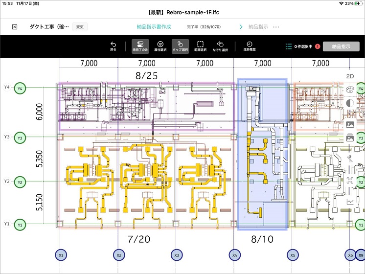- 部材を選択し、進捗情報を入力することができます。 指でなぞって選択したり、属性情報から選択したり、 直感的でシンプルに操作いただけます。