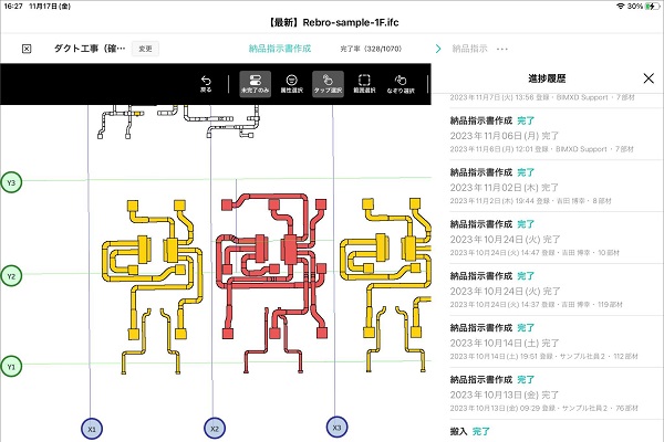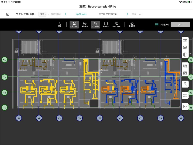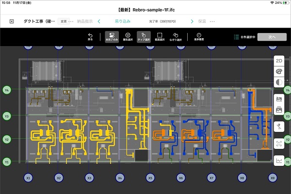 - 3Dモデルに直接施工進捗を登録することが可能です。登録された進捗はリアルタイムで共有されます。