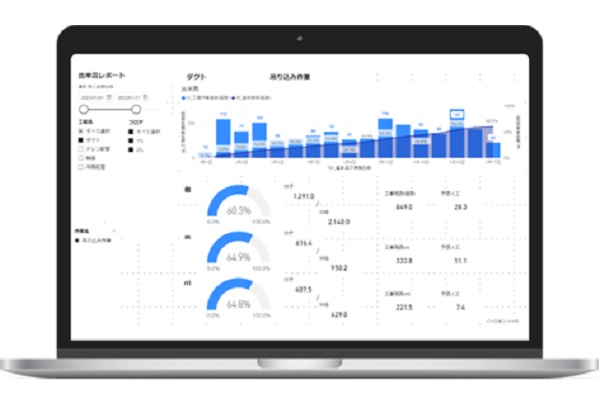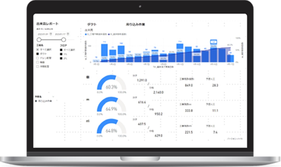 - BIMモデルと現場の進捗データを融合することにより、従来では 不可能だったリアルタイムな現場分析が可能になります。 出来高分析や、フロア毎の進捗率把握など、あらゆる角度から 自由に分析が行えます。分析レポートは現場毎にカスタマイズが可能です。