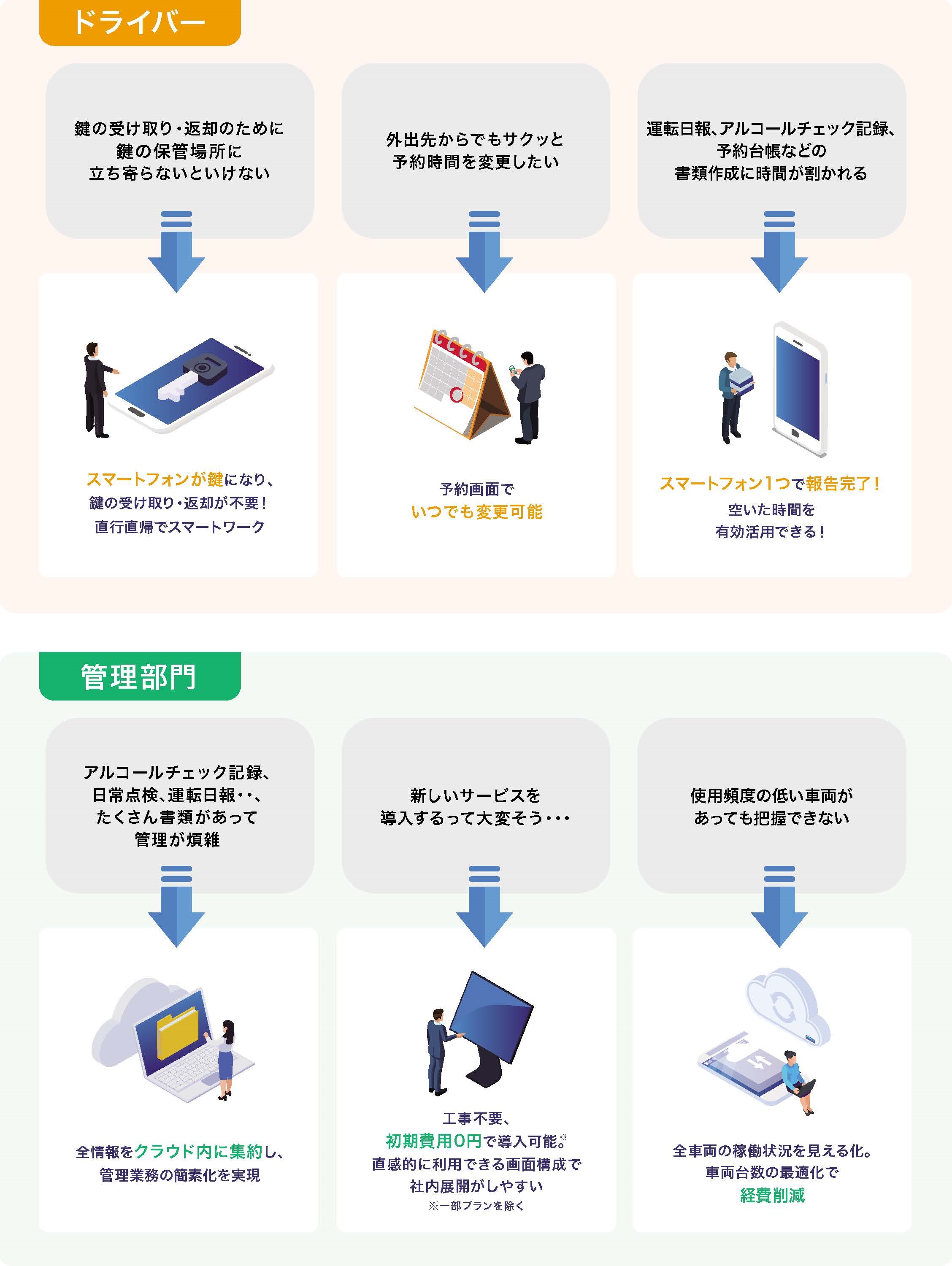 これにより、ドライバーと管理部門の両者に業務効率化をもたらし、社用車管理のDX化を推進します。